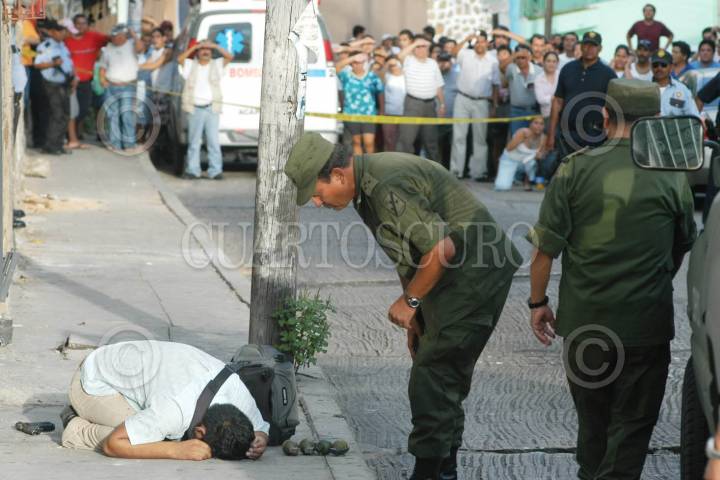 ACAPULCO, GUERRERO 15JUNIO2006.- Un coronel del ejercito se acerca al cuerpo del sicario asesinado, para sacar las cinco granadas que traía en el interior de una mochila para equipo fotográfico, tambien portaba una pistola Prieto Bereta. FOTO: Eric Miralrío/CUARTOSCURO.COM