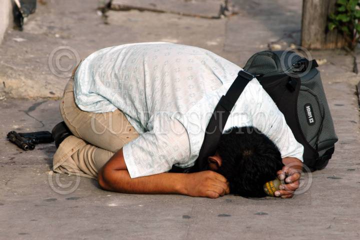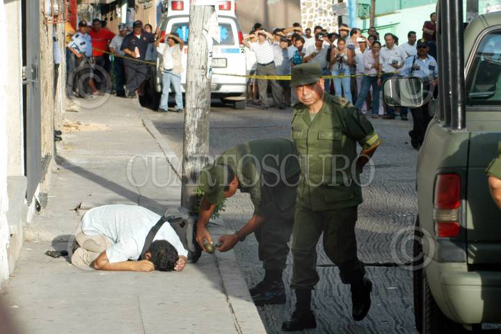ACAPULCO, GUERRERO 15JUNIO2006.- Un sicario fue asesinado, y su cuerpo fue dejato postrado sobre la banqueta, al morir, traia consigo cinco granadas que portaba en el interior de una mochila para equipo fotográfico, tambien se le encontró una pistola Prieto Bereta. FOTO: Eric Miralrío/CUARTOSCURO.COM