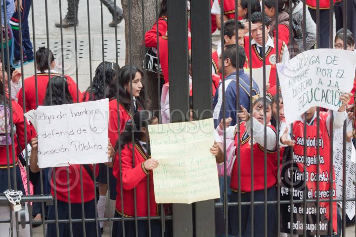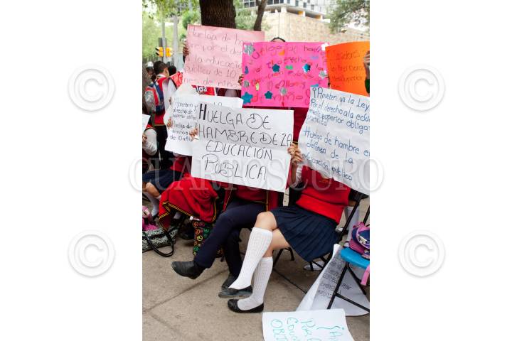 MÉXICO, D.F., 01JUNIO2011.- Estudiantes de secundaria se manifestaron afuera de la nueva sede del Senado de la República, en la exigieron con pancartas que los senadores aprueben la ley que garantice el derecho a la educación media superior obligatoria y gratuita. FOTO: MOISÉS PABLO/CUARTOSCURO.COM