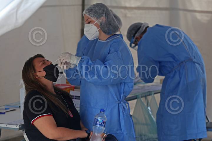 Una enfermera de la Secretaria de Salud Jalisco, realiza la prueba de Covid-19 a una mujer que acudió al modulo de pruebas gratuitas en el centro de Tlaquepaque.