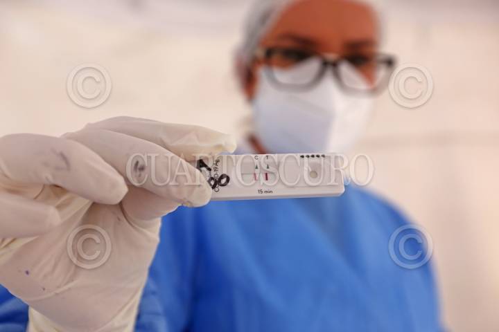 Una enfermera de la Secretaria de Salud Jalisco, muestra una prueba de Covid-19 que dio positivo y que se realizo durante la jornada en el modulo de pruebas gratuitas en el centro de Tlaquepaque.