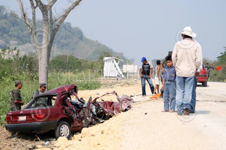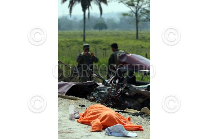MACUSPANA, TABASCO, 05ABRIL2009.- Una bebe de apenas dos años de edad pierde la vida en un accidente carretero a la altura del kilómetro 59 de la autopista Villahermosa-Escárcega. En dicho lugar militares dan ayuda sobre la cinta asfáltica, mientras que los padres de la occisa fueron trasladados al municipio de Catazaja, Chiapas gravemente heridos, por su parte el responsable del hecho quien invadió carril contrario al dormirse se dio a la fuga. FOTO: MARCO POLO GUZMÁN HERNÁNDEZ/CUARTOSCURO.COM