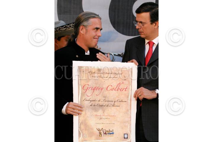 MÉXICO D.F. 25ABRIL2008.-El jefe de gobierno Marcelo Ebrard Casaubon, condecoro al fotografo canadiense Gregory Colbert, como embajador de turismo y cultura del D.F., durante la clausura del museo nomada. FOTO: SAÚL LÓPEZ/CUARTOSCURO.COM