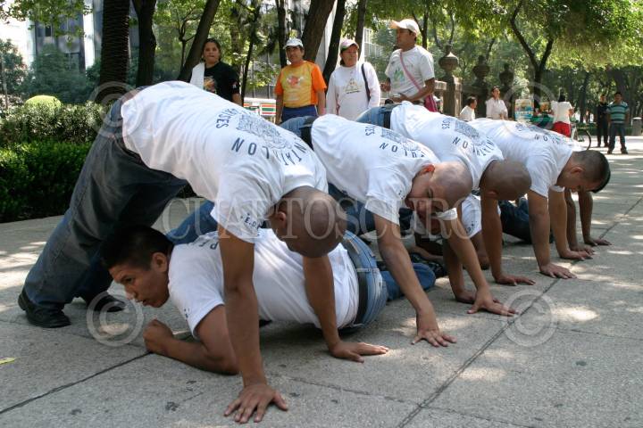 MÉXICO, D.F., 30MAYO2010.- Jóvenes integrantes del Pentathlon, Osos grises, practicaron rutinas de ejercicio sobre la acera de la avenida paseo de la Reforma. FOTO: ENRIQUE ORDOÑEZ/CUARTOSCURO.COM