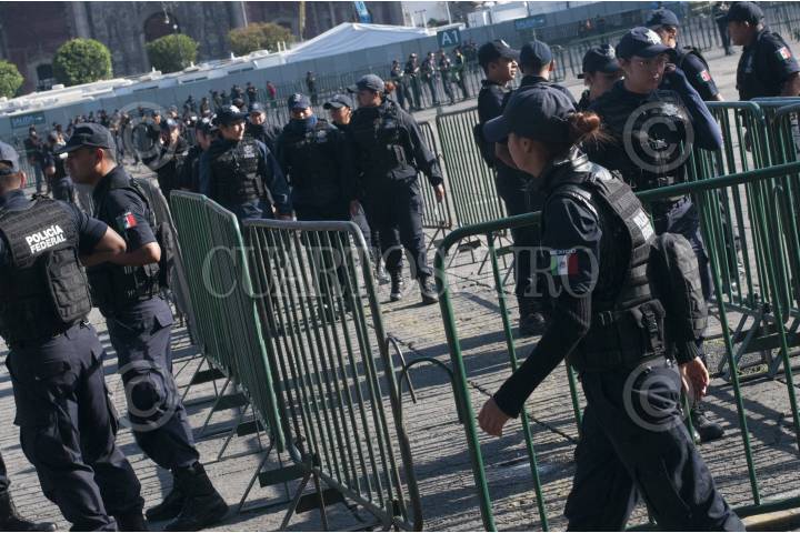 MÉXICO, D.F., 15SEPTIEMBRE2014.- Elementos del Estado Mayor Presidencial, Policia Federal y de la Gendarmería Nacional, vigilan los accesos a la plancha del zócalo capitalino, donde se llevará a cabo esta noche la ceremonia del grito de la Independencia, encabezado por Enrique Peña Nieto, presidente de México. FOTO: DIEGO SIMÓN SÁNCHEZ /CUARTOSCURO.COM