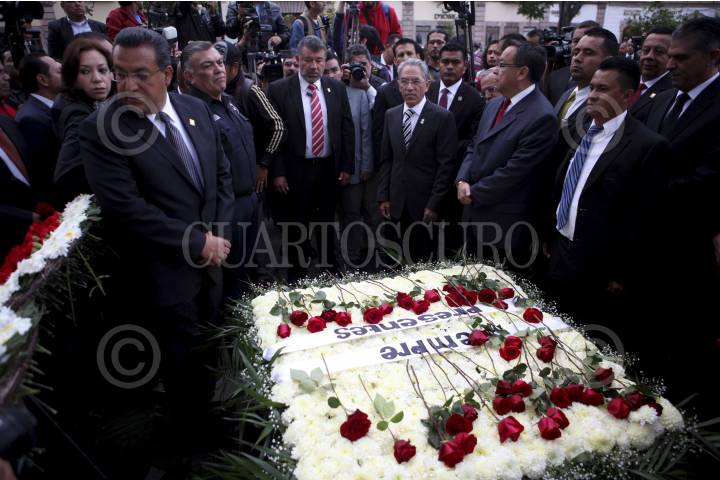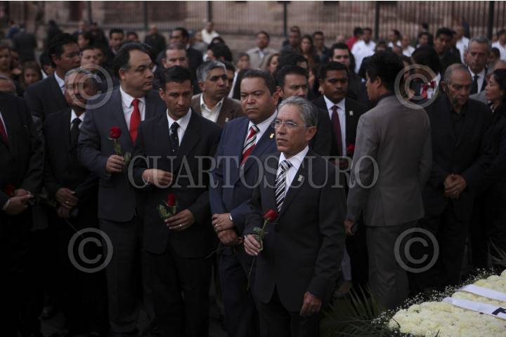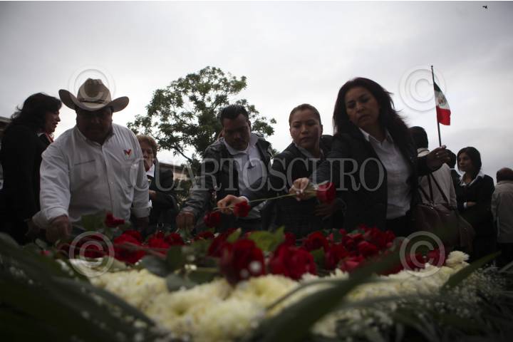 MORELIA, MICHOACÁN, 15AGOSTO2014.- Esta mañana el gobernador, Salvador Jara Guerrero en compañía del presidente municipal, Wilfrido Lázaro Medina, acudieron a depositar la ofrenda conmemorativa a 6 años del atentado que cobró 8 vidas en 2008, por una granada lanzada a la multitud mientras se realizaba la ceremonia del grito de la Independencia en Palacio de Gobierno. FOTO: ALAN ORTEGA / CUARTOSCURO.COM