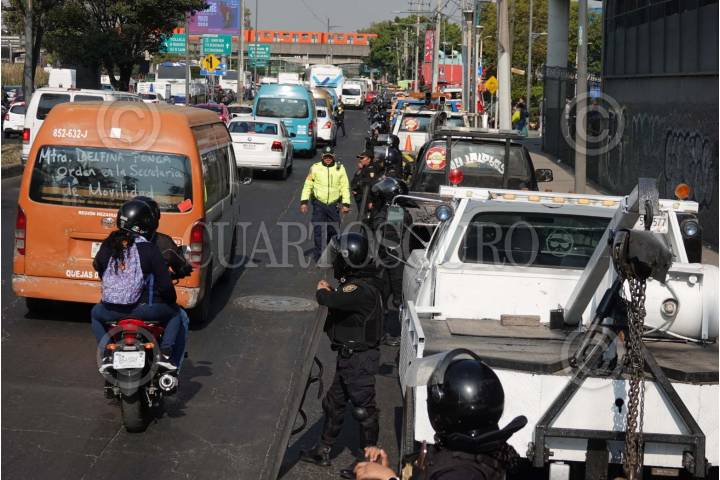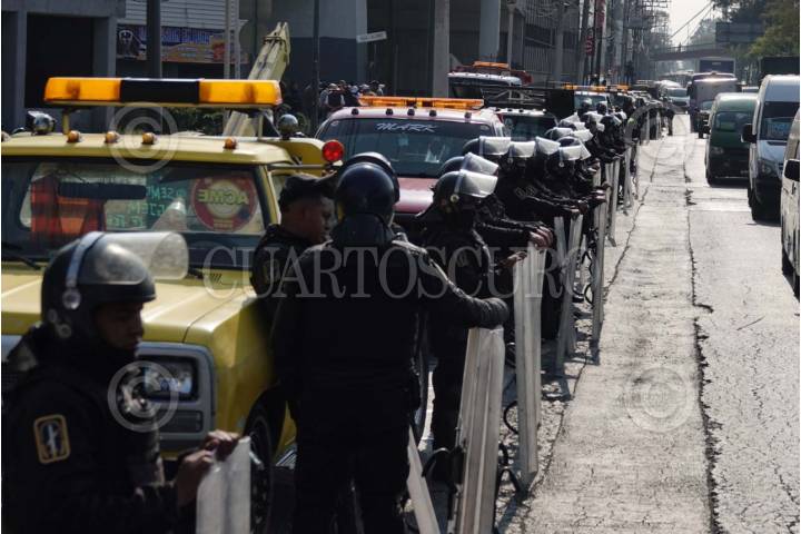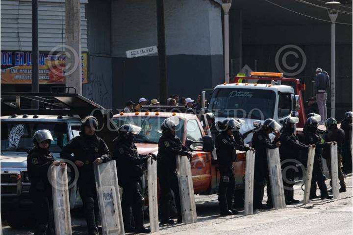 CIUDAD DE MÉXICO, 17FEBRERO2025.- Elementos de la Secretaria de Seguridad Ciudadana bloquearon grúas de choferes en Avenida Zaragoza, alcaldía Iztapalapa, quienes exigen un alto a robos y extorsiones. FOTO: GRACIELA LÓPEZ/CUARTOSCURO.COM