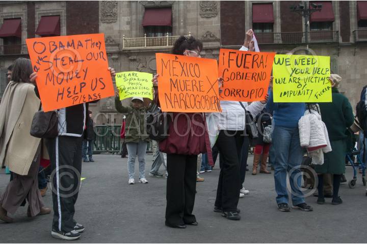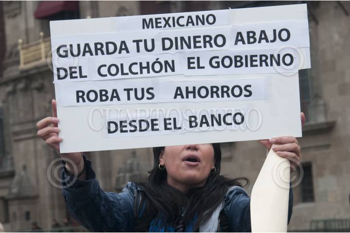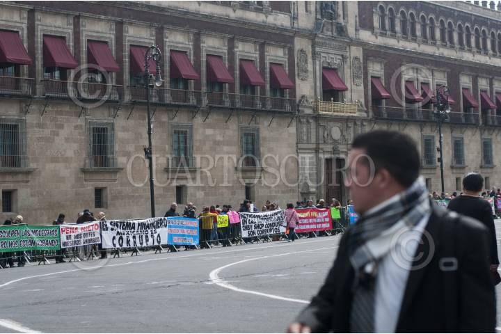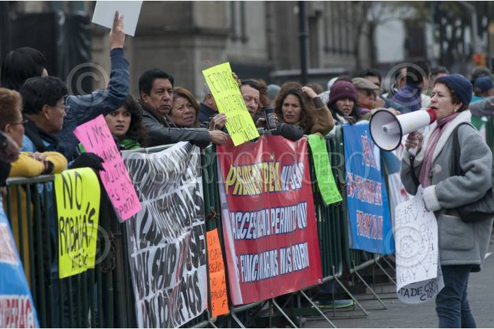 MÉXICO, D.F., 08ENERO2015.- Ahorradores defraudados por la sociedad financiera popular Ficrea se manifestaron afuera del Palacio Nacional para exigir la captura de Rafael Olvera Amezcua, principal socio de Ficrea y exigir al presidente Enrique Peña Nieto, la recuperación de su dinero al 100%, luego de que Amezcua desviara dos mil 700 millones de pesos. FOTO: DIEGO SIMÓN SÁNCHEZ /CUARTOSCURO.COM