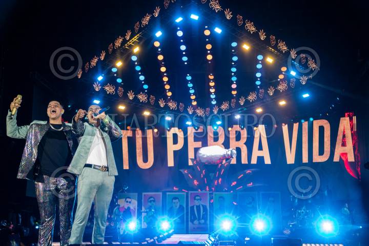 CIUDAD DE MÉXICO, 27JUNIO2025.- Jhonny Caz y Eduin Caz, vocalistas de Grupo Firme, agrupación de música regional mexicana, durante concierto esta noche en el Estadio GNP Seguros. FOTO: MARIO JASSO/CUARTOSCURO.COM