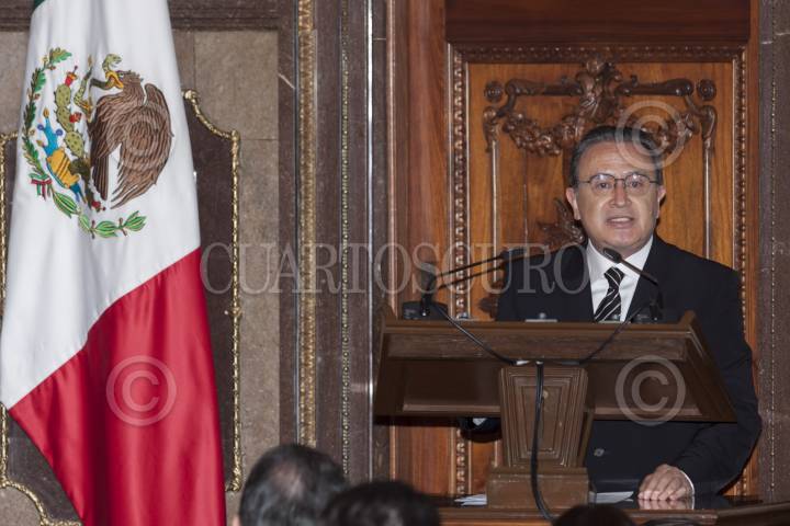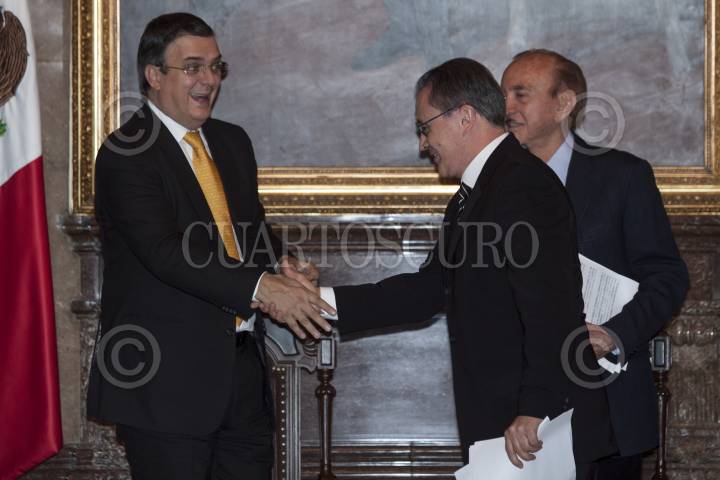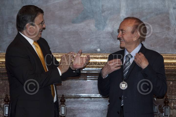 MÉXICO, D.F., 03OCTUBRE2012.- Marcelo Ebrard, jefe de gobierno del Distrito Federal entregó el pergamino y medalla de ciudadano distinguido a Rogelio Azcarraga, presidente de Grupo Formula en el Salón de los Cabildos del Antiguo Palacio del Ayuntamiento. FOTO: RODOLFO ANGULO /CUARTOSCURO.COM