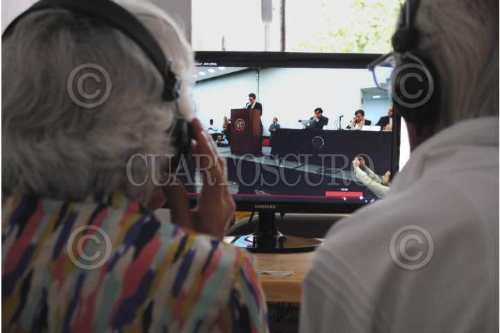 CHILPANCINGO, GUERRERO, 06SEPTIEMBRE2015.- Una pareja de adultos mayores escuchan y miran en un café internet, el informe del grupo Interdisciplinar de Expertos Independientes (GIE) de la Comisión Interamericana de Derechos humanos (CIDH), respecto al caso Iguala, en donde 43 normalistas fueron desaparecidos. FOTO: JOSÉ I. HERNÁNDEZ / CUARTOSCURO.COM