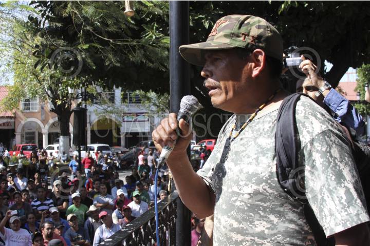BUENAVISTA TOMATLA, MICHOACÁN. 21FEBRERO2014.- Lo que se muestra: Simón el Americano explica ante la población de Buenavista Tomatlán las divisiones existentes entre Hipólito Mora y Papá Pitufo y el resto de grupos de autodefensa. Esta intevrención pública del líder de las autodefensas en aquella población se da en medio de un fuerte repudio de la población ante el regreso del presidente municipal Luis Torres (PRI) anunciado el día de ayer por Hipólito Mora. FOTO: JUAN JOSÉ ESTRADA SERAFÍN /CUARTOSCURO.COM