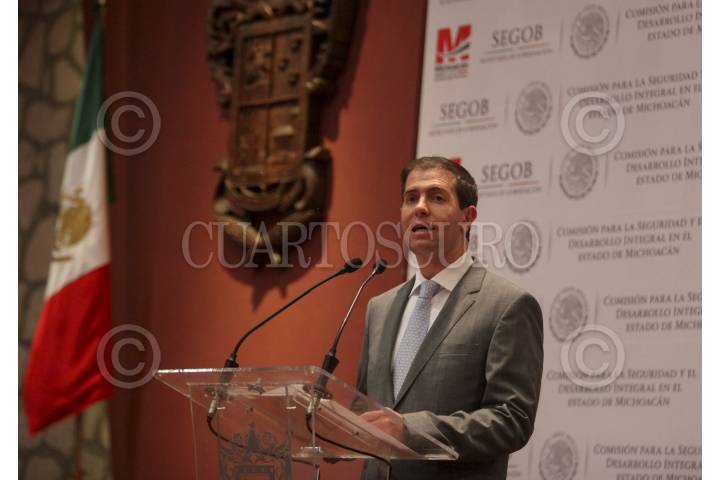 MORELIA, MICHOACÁN. 12MAYO2014.- Alfredo Castillo Cervantes, comisionado para la Seguridad y Desarrollo Integral de Michoacán, sostuvo un encuentro con medios de comunicación en el que por medio de la lectura de un comunicado dio a conocer la detención del jefe de plaza de Arteaga y Tumbiscatío, así como la versión oficial del proceso de legalización de las autodefensas en Michoacán. FOTO: ALAN ORTEGA /CUARTOSCURO.COM