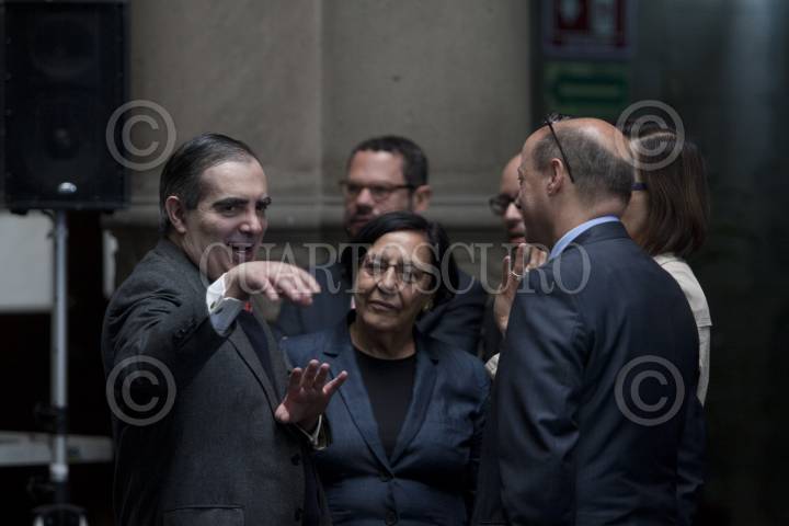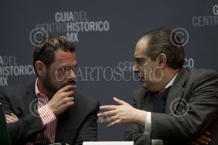 MÉXICO, D.F., 18JULIO2012.- Guillermo Osorno Covarrubias, editor de la Guía del Centro Histórico, y Guillermo Tovar y de Teresa "cronista de la Ciudad de México", durante la presentación de esta la Guía del Centro Histórico la cual no solamente será impresa sino que también estará disponible por Internet, la ceremonia se realizó en el Antiguo Palacio del Ayuntamiento. FOTO: MOISÉS PABLO /CUARTOSCURO.COM