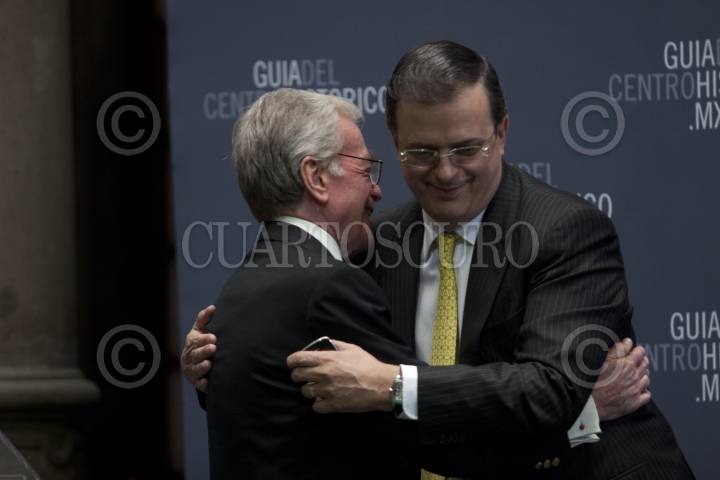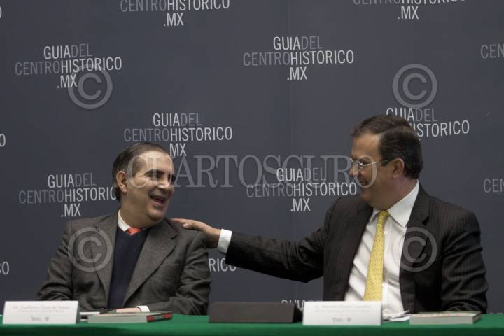 MÉXICO, D.F., 18JULIO2012.- Guillermo Tovar y de Teresa "cronista de la Ciudad de México, y Marcelo Ebrard Casaubón, Jefe de Gobierno, durante la presentación de la nueva Guía del Centro Histórico de México, la cual no solamente será impresa sino que también estará disponible por Internet, la ceremonia se realizó en el Antiguo Palacio del Ayuntamiento. FOTO: MOISÉS PABLO /CUARTOSCURO.COM