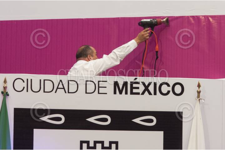 MÉXICO, D.F., 23JULIO2015.- Un trabajador del gobierno capitalino plancha las arrugas de un vinil que sirve de cenefa para la presentación de la guía general de prevención y preparación en situaciones de emergencia para las personas con discapacidad en el Museo de la Ciudad de México, evento encabezado por Miguel Ángel Mancera, jefe de gobierno capitalino. FOTO: DIEGO SIMÓN SÁNCHEZ /CUARTOSCURO.COM