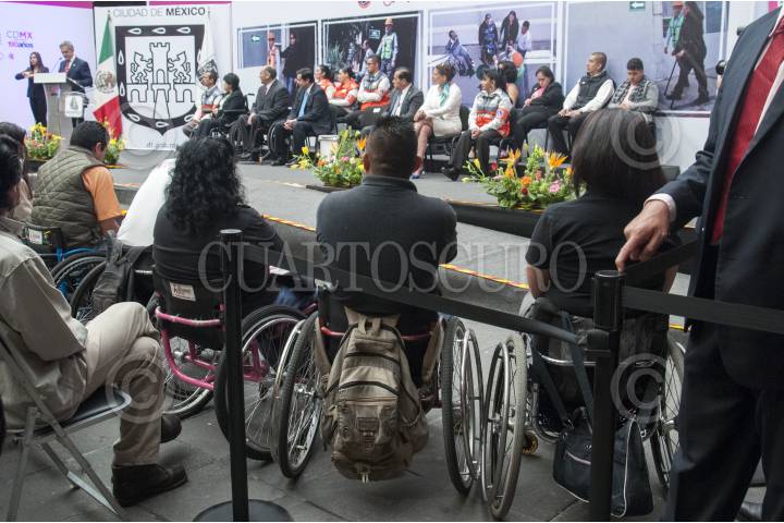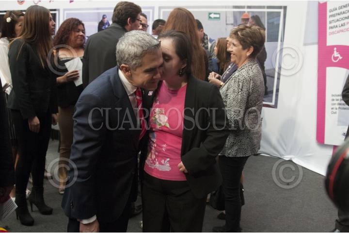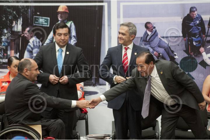 MÉXICO, D.F., 23JULIO2015.- Fausto Lugo García, titular de Protección Civil capitalina; Miguel Ángel Mancera, jefe de gobierno capitalino, y Fidel Pérez de León, titular del Instituto para la Integración al Desarrollo de las Personas con Discapacidad del Distrito Federal (Indepedi), encabezaron la presentación de la guía general de prevención y preparación en situaciones de emergencia para las personas con discapacidad en el Museo de la Ciudad de México. FOTO: DIEGO SIMÓN SÁNCHEZ /CUARTOSCURO.COM