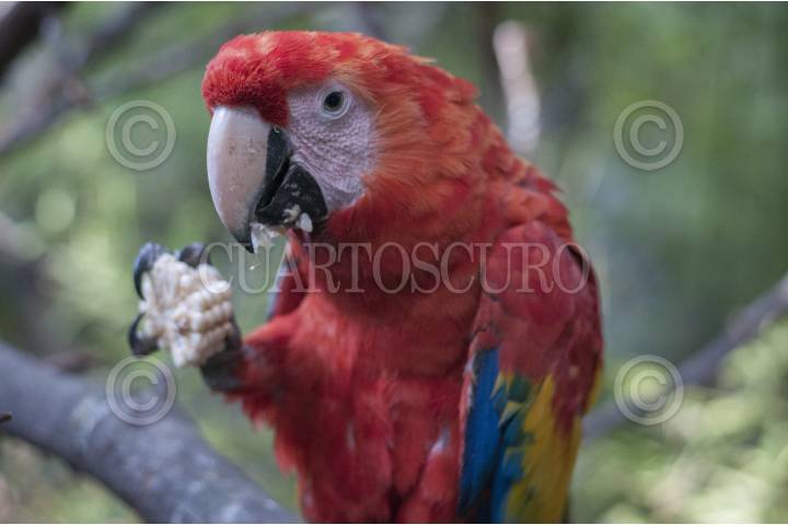 TECALI DE HERRERA, PUEBLA, 25JULIO2014.- Una guacamaya comiendo un elote. Cientos de familias aprovechan el periodo vacacional de verano para visitar el parque Africam Safari, un espacio para convivir con más de 2500 animales de 200 especies de todo el mundo que se encuentran viviendo en condiciones semejantes a su hábitat natural. El recorrido se hace por una vereda ya sea en auto particular o autobús mientras se convive con la fauna que vive a un costado de la laguna de Valsequillo. Como dato curioso, semanalmente en Africam se consume 3.6 toneladas de carne, 2800 kilos de piezas de pollo, 5 toneladas de frutas y verduras, 504000 litros de agua, 18 toneladas de pastura, 3.5 toneladas de alimento concentrado y 1 tonelada de semillas. FOTO: DIEGO SIMÓN SÁNCHEZ /CUARTOSCURO.COM