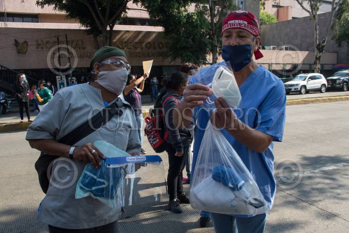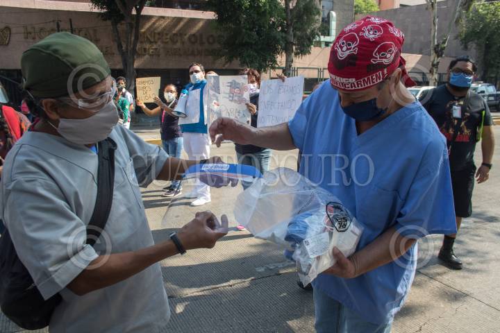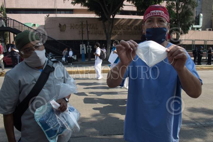 Un par de camilleros hacen una demostración del kit de protección que reciben para atender a pacientes de Covid-19, y señalan las deficiencias que tiene