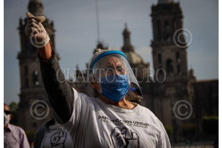 Mujer de tercera edad se manifiesta frente al Antiguo Palacio de Gobierno para exigir transparencia y rápidez con la reconstrucción de su vivienda derrumbada en el sismo de septiembre de 2017