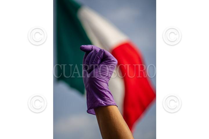 La mano de una manifestante queda frente a la bandera Mexicana ubicada en el Zócalo Capitalino