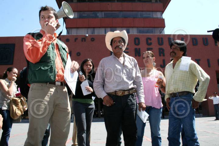 TOLUCA, ESTADO DE MEXICO, 31MAYO2007.- Con carteles en los que se exige la captura de los asesinos del campesino ecologista Aldo Zamora, activistas de Greenpeace, se manifestaron frente a la Procuraduria General de Jusitica de la entidad. Tambien participó el padre del joven asesinado Ildefonso Zamora y Héctor Magallon, coordinador de la campaña de Bosques y Selvas de Greenpeace Mexico. FOTO: CARLOS TISCHLER/CUARTOSCURO.COM