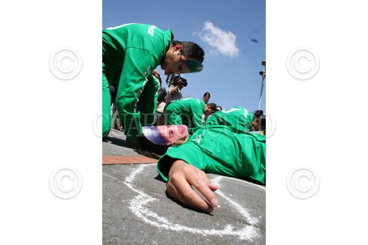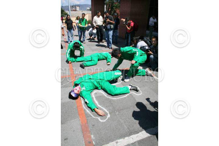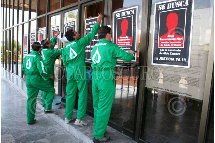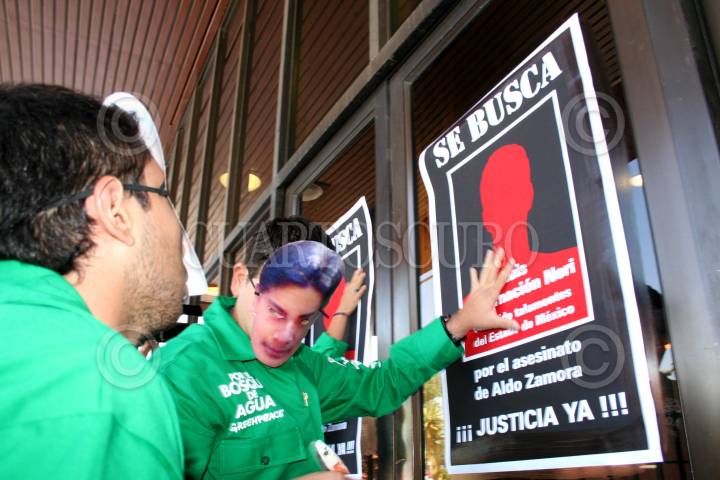 TOLUCA, ESTADO DE MEXICO, 31MAYO2007.- Con carteles en los que se exige la captura de los asesinos del campesino ecologista Aldo Zamora, activistas de Greenpeace, se manifestaron frente a la Procuraduria General de Jusitica de la entidad. FOTO: CARLOS TISCHLER/CUARTOSCURO.COM