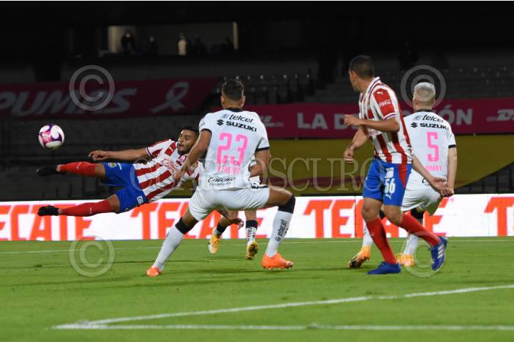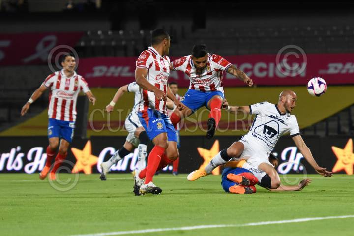 Carlos González, delantero de Pumas, supera a la defensa de Chivas para disparar.