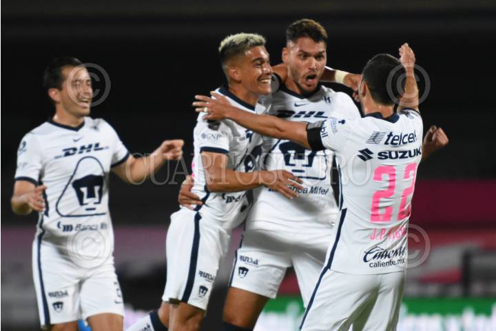 Fabio Álvarez, delantero de Pumas, celebra el gol con Nicolás Freire.