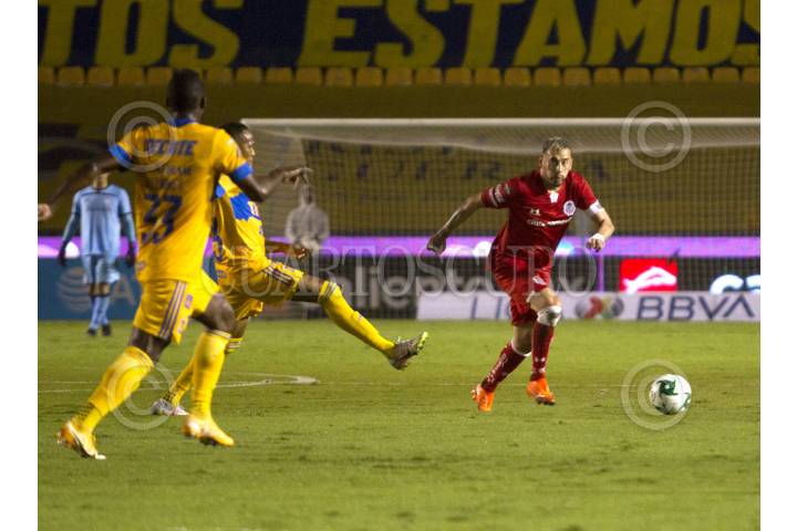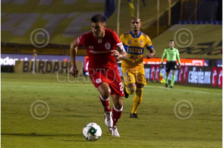 Luis Rodríguez del equipo de los Tigres de la UANL, disputa el balón con Giovanny León del equipo de Toluca en el estadio Universitario, partido de repechaje a pase en la Liguilla, la Liga MX, Guardianes 2020. Marcador Final: Tigres: 2 - Toluca: 1 FOTO: GABRIELA PÉREZ MONTIEL / CUARTOSCURO.COM