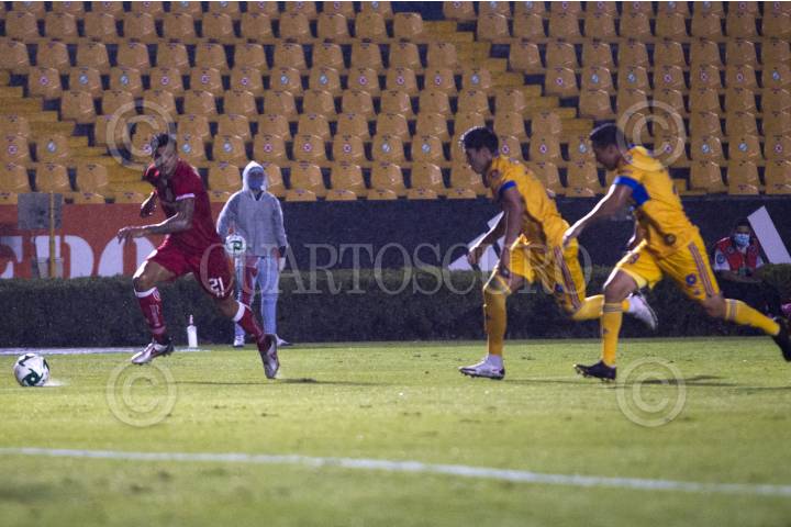 Jesús Dueñas del equipo de los Tigres de la UANL, disputa el balón con Enrique Triverio del equipo de Toluca en el estadio Universitario, partido de repechaje a pase en la Liguilla, la Liga MX, Guardianes 2020. Marcador Final: Tigres: 2 - Toluca: 1 FOTO: GABRIELA PÉREZ MONTIEL / CUARTOSCURO.COM