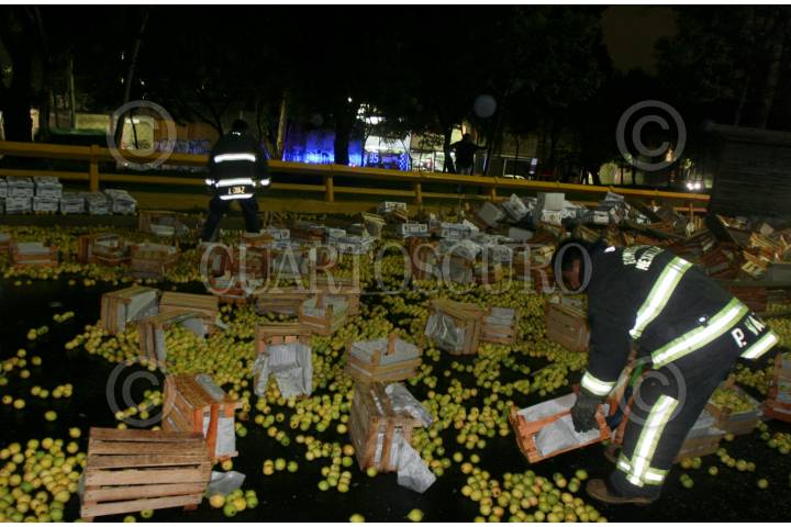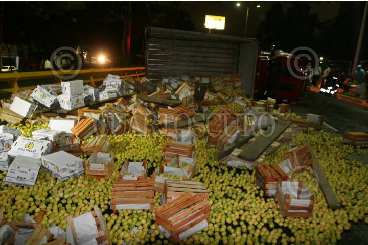 MÉXICO, D.F. 02AGOSTO2011.- Un camión con nueve toneladas de guayabas volcó esta madrugada sobre el Circuito Interior Río Churubusco a la altura de la Calzada La Viga lo que obligó al cierre con dirección al sur por más de cuatro horas. FOTO: LM ACEVEDO/CUARTOSCURO.COM