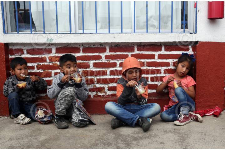 HUITZILAC, MORELOS, 29ABRIL2018.- Cuatro niños del pueblo indígena de Coajomulco comen un flan durante el mitin del priista Jorge Meade Ocaranza. Este día iniciaron las campañas por la gubernatura. FOTO: MARGARITO PÉREZ RETANA /CUARTOSCURO.COM
