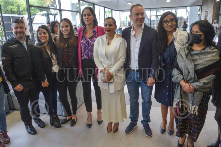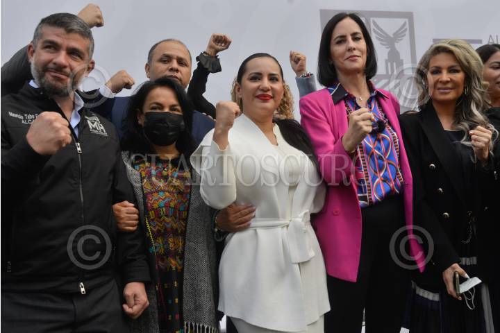 Sandra Cuevas, alcaldesa de Cuauhtémoc, en compañía de los alcaldes: Mauricio Tabe (Miguel Hidalgo); Lía Limón (Álvaro Obregón), Santiago Taboada (Benito Juárez), y Margarita Zaldaña,(Azcapotzalco), en las instalaciones del Deportivo Guelatao.