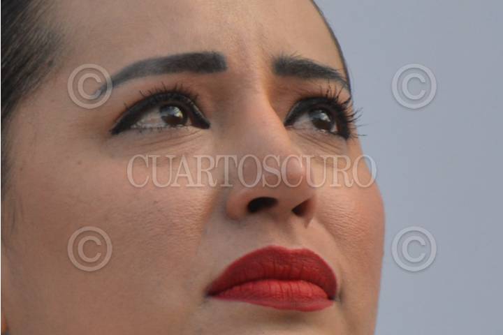 Sandra Cuevas, alcaldesa de Cuauhtémoc, durante su llegada al Deportivo Guelatao, en el que ofreció un discurso.
