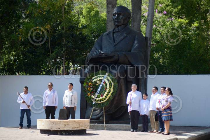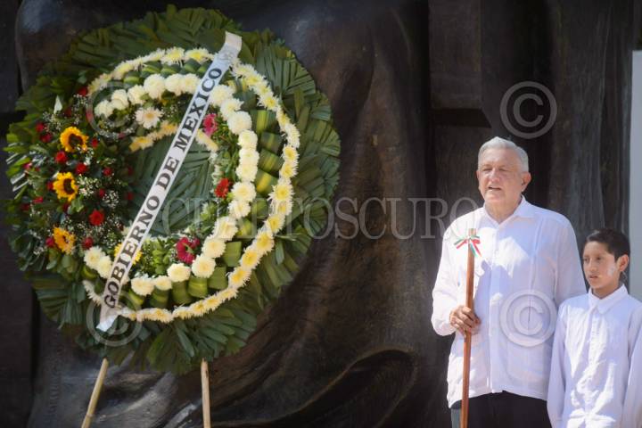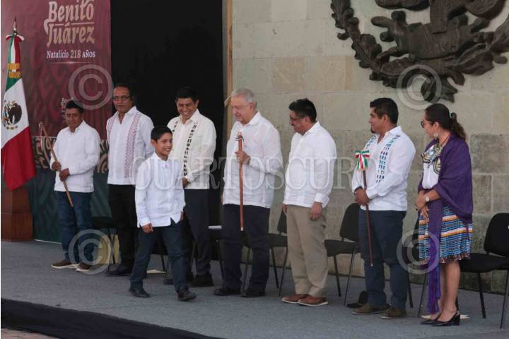 GUELATAO DE JUÁREZ, OAXACA, 21MARZO2024.- Andrés Manuel López Obrador, presidente Constitucional de los Estados Unidos Mexicanos, presidió el 218 Aniversario del Natalicio de Benito Juárez. Lo acompañan Adelfo Andrés Cayetano Bautista, presidente municipal de San Andrés Solaga, Oaxaca y presidente de la Asociación Regional de Comunidades Indígenas del Pueblo Xhidza y Xhon (Zapoteco) de la Sierra Juárez de Oaxaca; Aldo González Rojas, presidente municipal de Guelatao de Juárez, Oaxaca; Salomón Jara Cruz, gobernador Constitucional del Estado de Oaxaca; Adelfo Regino Montes, director general del Instituto Nacional de los Pueblos Indígenas. FOTO: PRESIDENCIA/CUARTOSCURO.COM