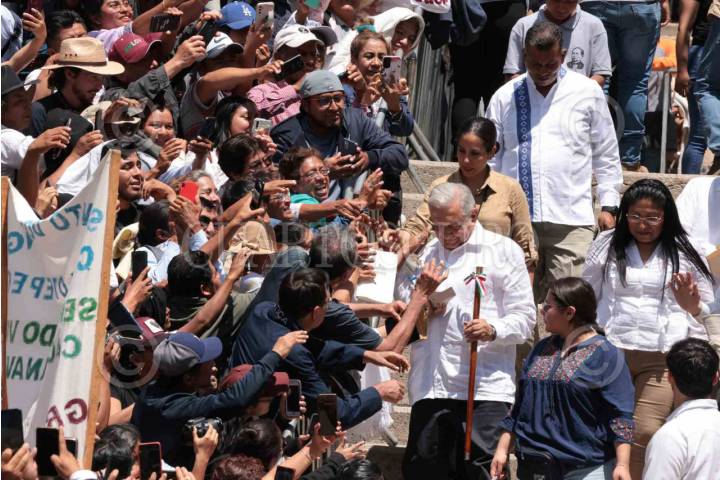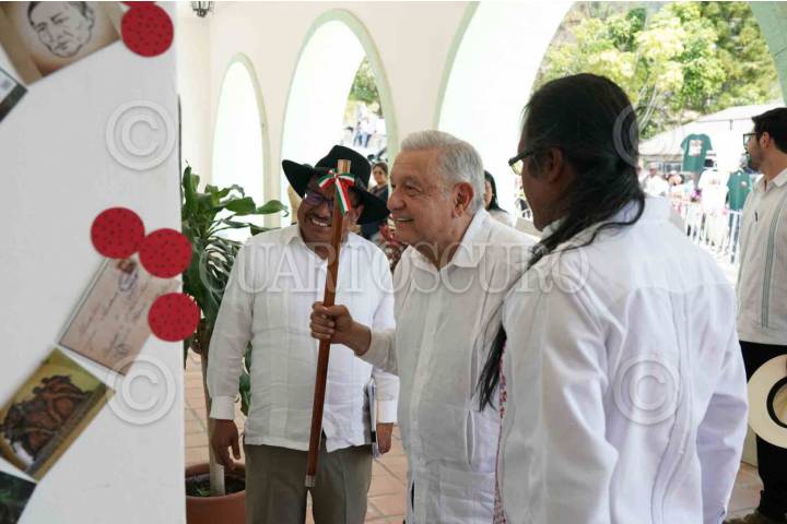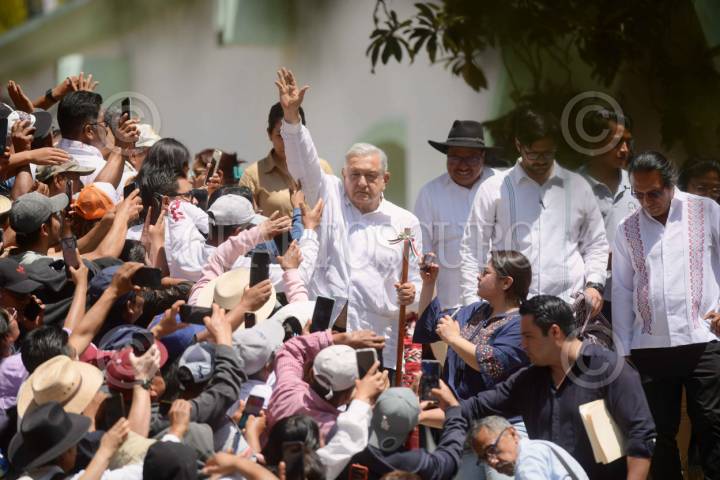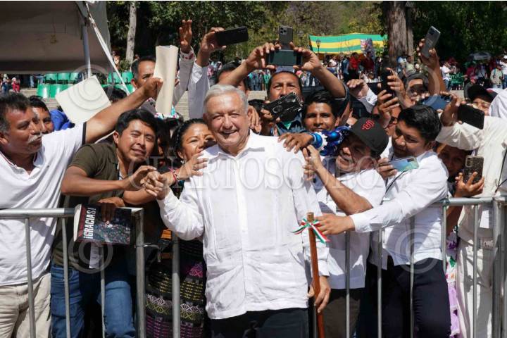 GUELATAO DE JUÁREZ, OAXACA, 21SEPTIEMBRE2024.- El presidente Andrés Manuel López Obrador  acompañado de la presidenta electa Claudia Sheinbaum Pardo encabezaron en la comunidad de Guelatao de Juárez,  zona de la Sierra Norte de Oaxaca, la inauguración del Camino Artesanal “Benito Juárez”, así cómo la realización de un informe sobre el programa Caminos Artesanales, desarrollado en municipios del estado. El camino artesanal “Benito Juárez” rememora la ruta que siguió el benemérito de las americas de su natal Guelatao a la Ciudad de Oaxaca, y es una oportunidad para que las personas disfruten de paisajes, flora y fauna de la región. FOTO: CAROLINA JIMÉNEZ/CUARTOSCURO.COM