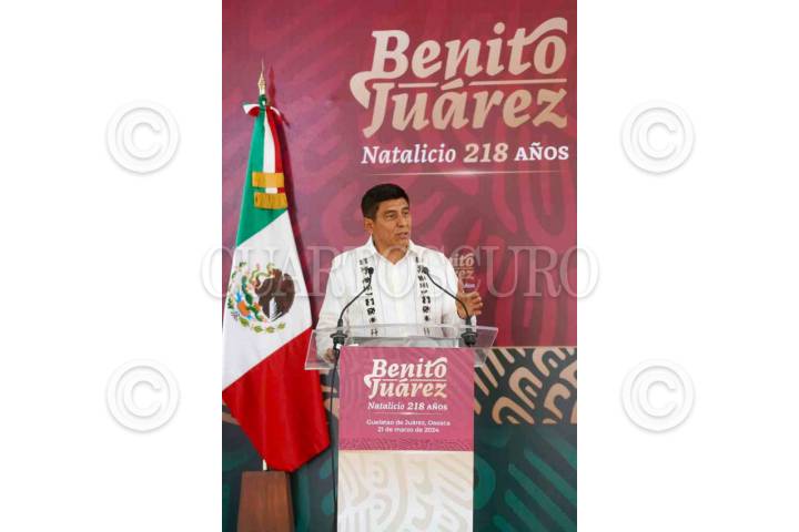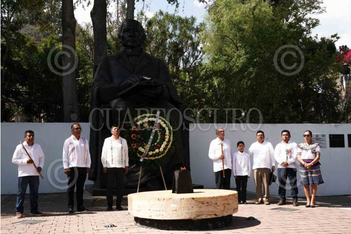 GUELATAO DE JUÁREZ, OAXACA, 21MARZO2025.- La presidenta de la República Claudia Sheinbaum Pardo presidió el homenaje por el 219 aniversario del natalicio de Benito Juárez en la comunidad serrana de Guelatao de Juárez, Oaxaca, lugar en donde nació el Benemérito de la Américas. Acompañada del gobernador del estado, Salomón Jara Cruz y funcionarios federales y estatales, así como autoridades de comunidades serranas, elogió el legado del oaxaqueño quien dijo estaría orgulloso de la próxima elección popular de integrantes del Poder Judicial. Además recalcó la soberanía del país y su defensa haciendo eco de la frase emblemática de Juárez: “Entre los individuos como entre las naciones unidas, el respeto al derecho ajeno es la paz”.  Durante el acto un grupo de integrantes de la Sección 22 de la Coordinadora Nacional de Trabajadores de la Educación (CNTE) mostraron pancartas y gritaron consignas contra la Ley del ISSSTE.  FOTO: CAROLINA JIMÉNEZ/CUARTOSCURO.COM