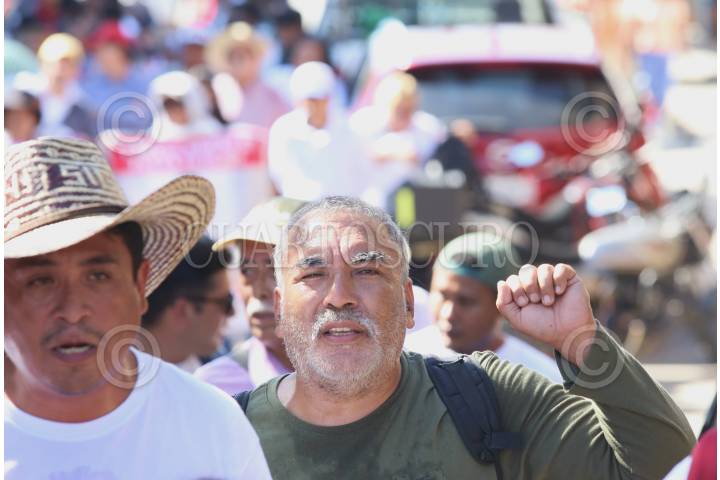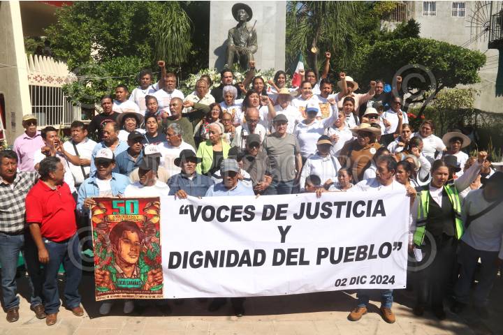 ATOYAC DE ALVAREZ, GUERRERO, 02DICIEMBRE2024.-Familiares de guerrilleros que participaron en el Movimiento Socialista Armado de México marcharon en este municipio para conmemorar la caída en combate de Lucio Cabañas el dos de diciembre de 1974 en la cañada del Otatal en el municipio de Tecpan de Galeana. La marcha fue encabezada por Micaela Cabañas Ayala, hija del maestro normalista, que después de la matanza del 18 de mayo de 1967 se remonto a la sierra cafetalera de este municipio para organizar el Partido de los Pobres y su Brigada Campesina de Ajusticiamiento que opero hasta su muerte. Los familiares de guerrilleros estuvieron acompañados por estudiantes de la Normal Rural de Ayotzinapa, familias de personas desaparecidas en la actualidad y lideres de organizaciones sociales de izquierda. La marcha concluyo con un mitin en el zócalo de la ciudad, a los pies del profesor Lucio Cabañas Barrientos. En la imagen al centro, Florencio Lugo Hernández, ex guerrillero que participo en el asalto al cuartel de Madera, Chihuahua el 23 de septiembre de 1965 y actualmente único sobreviviente de esa acción guerrillera. FOTO: MARGARITO PÉREZ RETANA/CUARTOSCURO.COM