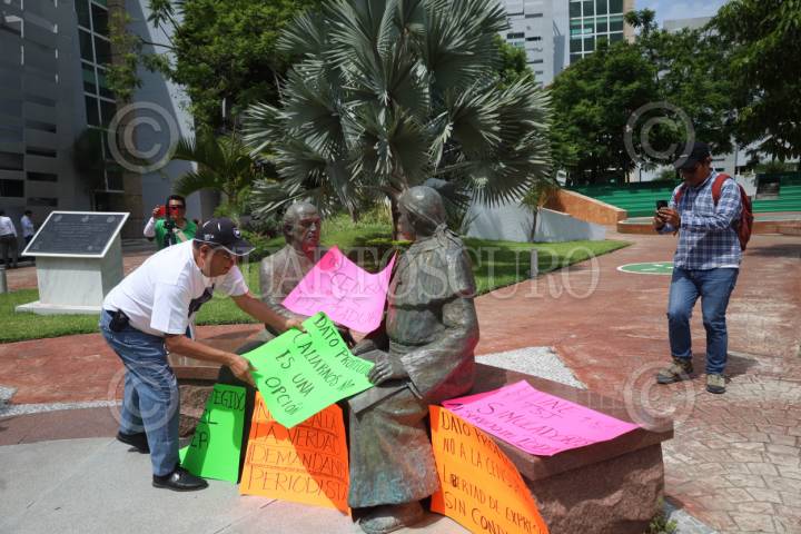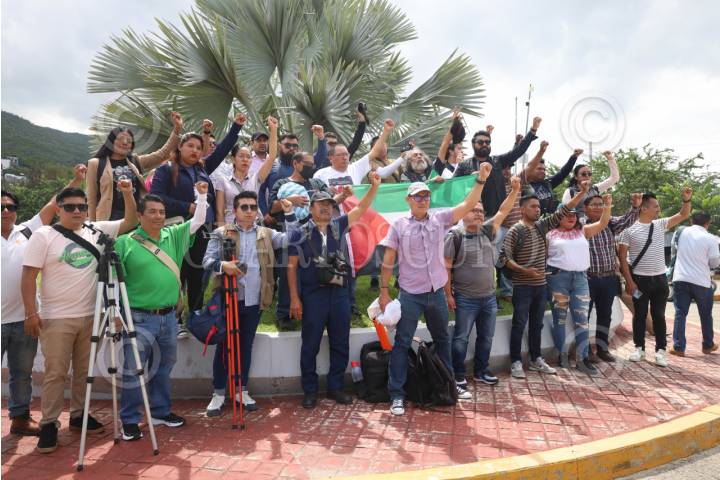 CHILPANCINGO, GUERRERO, 12AGOSTO2025.- Periodistas y representantes de distintos medios de comunicación en Chilpancingose manifestaron al exterior de las instalaciones de Ciudad Judicial, en respaldo al medio de comunicación independiente “El Tlacolol”, luego de que el Instituto Nacional Electoral (INE) iniciara procedimientos legales en su contra. Durante el acto, los comunicadores José Miguel Sánchez y Jazmín García dieron lectura a un posicionamiento en el que denunciaron un “hostigamiento” hacia la plataforma, la cual enfrenta dos denuncias derivadas del reciente proceso de elección judicial, una por presunta inducción al voto y otra por violencia política en razón de género. Los manifestantes hicieron un llamado al INE y a las autoridades competentes a analizar los hechos de manera justa y contextualizada, y exhortaron a la sociedad y actores políticos a respetar y proteger el periodismo independiente como un pilar para la democracia y el combate a la corrupción. FOTO: DASSAEV TÉLLEZ ADAME/CUARTOSCURO.COM