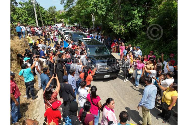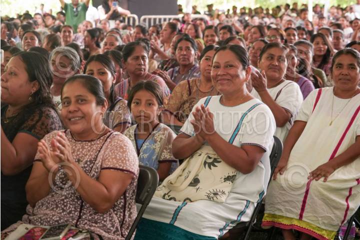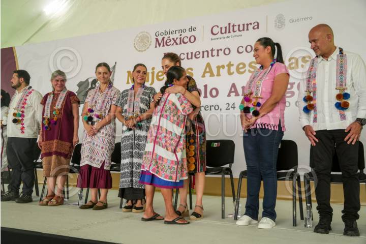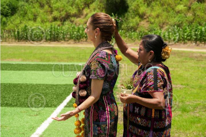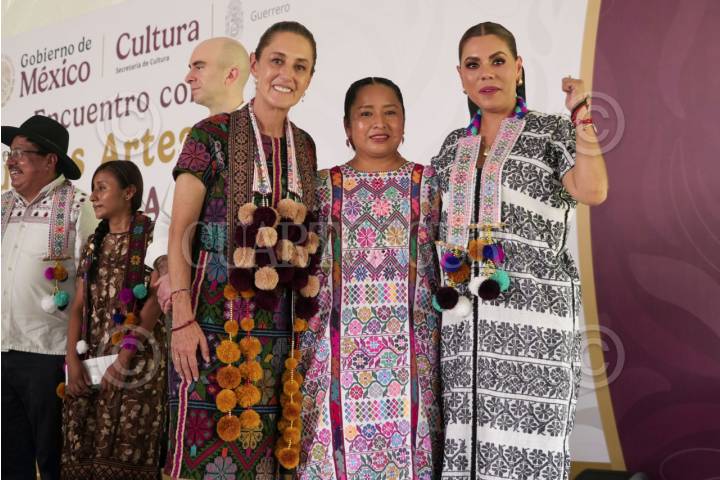 XOCHISTLAHUACA, GUERRERO, 24AGOSTO2025.- Claudia Shienbaum Pardo, Presidenta de México, y Evelyn Salgado, gobernadora de Guerrero, encabezaron una asamblea con mujeres artesanas de Xochistlahuaca. Las anfitrionas recibieron a la mandataria con una limpia para fortalecerla. FOTO: PRESIDENCIA/CUARTOSCURO.COM