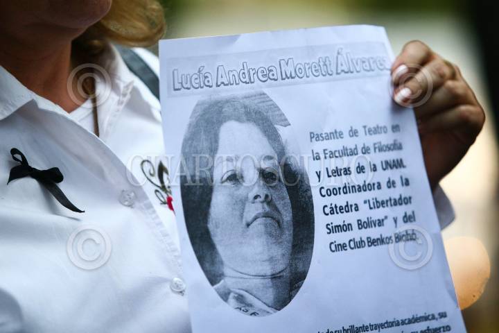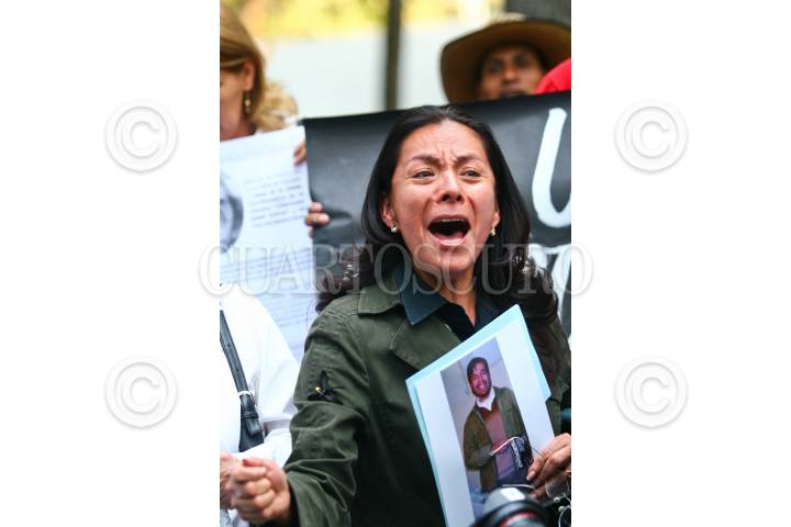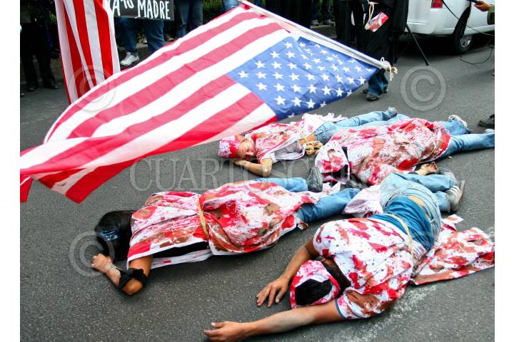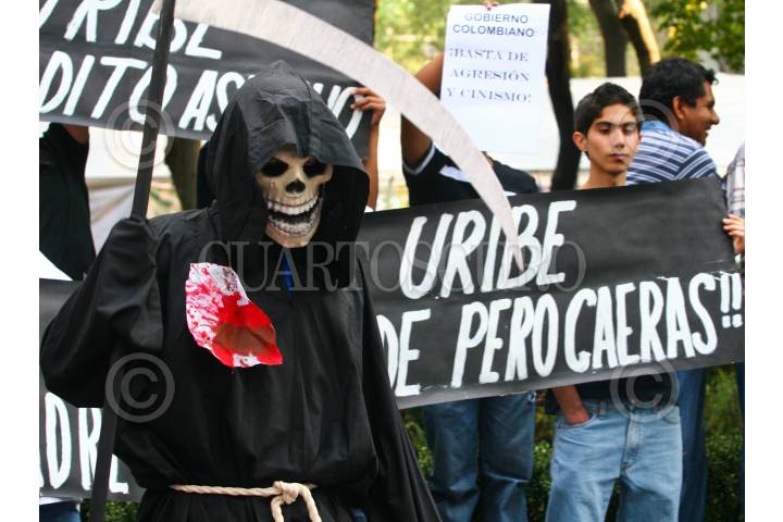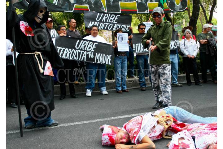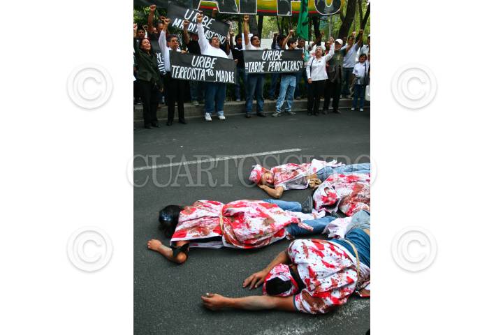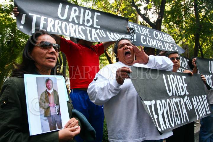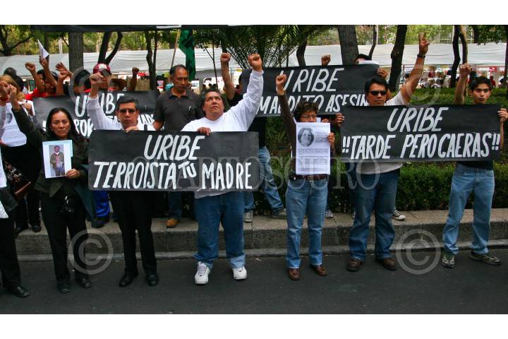 MÉXICO D.F., 27MARZO2008.- Familiares, activistas y simpatizantes de los cuatro estudiantes muertos durante un bombardeo de Colombia a un campamento de las FARC en Ecuador se manifestaron frente a la embajada colombiana en contra del presidente Álvaro Uribe. FOTO: ISAAC ESQUIVEL/CUARTOSCURO.COM
