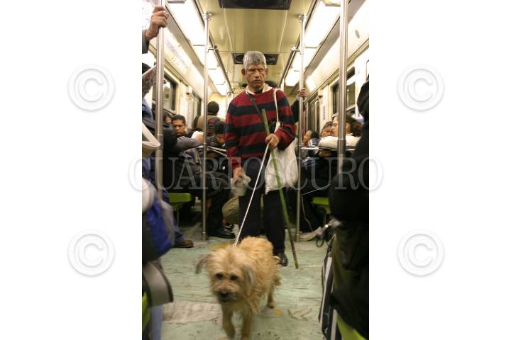 México, D.F., 11FEBRERO2005.- Una persona invidente acompañado de su perro guía, canta una canción para ganarse un dinero dentro de los vagones del metro de la ciudad. FOTO: Moisés Pablo/CUARTOSCURO.COM