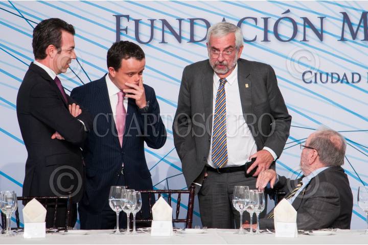 CIUDAD DE MÉXICO, 29MARZO2016.- Alejandro Ramírez, director de Cinépolis; Mikel Arriola, Director General del IMSS; Enrique Graue, rector de la Universidad Nacional Autónoma de México (UNAM), y el doctor Guillermo Soberón Acevedo, platican previo al evento de la XXXV Asamblea General Ordinaria de la Fundación Mexicana para la Salud en un hotel de Polanco. FOTO: DIEGO SIMÓN SÁNCHEZ /CUARTOSCURO.COM
