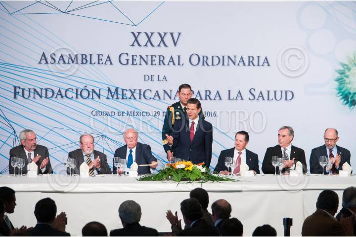 CIUDAD DE MÉXICO, 29MARZO2016.- Enrique Graue, rector de la Universidad Nacional Autónoma de México (UNAM); el doctor Guillermo Soberón Acevedo; José Narro Robles, secretario de salud, Enrique Peña Nieto, presidente de México; Pablo Escandón Cusi, presidente del Consejo directivo de la Fundación Mexicana para la Salud; José Campillo García, presidente ejecutivo de la fundación mexicana para la salud, y José Ramón Cossio, ministro de la SCJN, durante la XXXV Asamblea General Ordinaria de la Fundación Mexicana para la Salud en un hotel de Polanco. FOTO: DIEGO SIMÓN SÁNCHEZ /CUARTOSCURO.COM