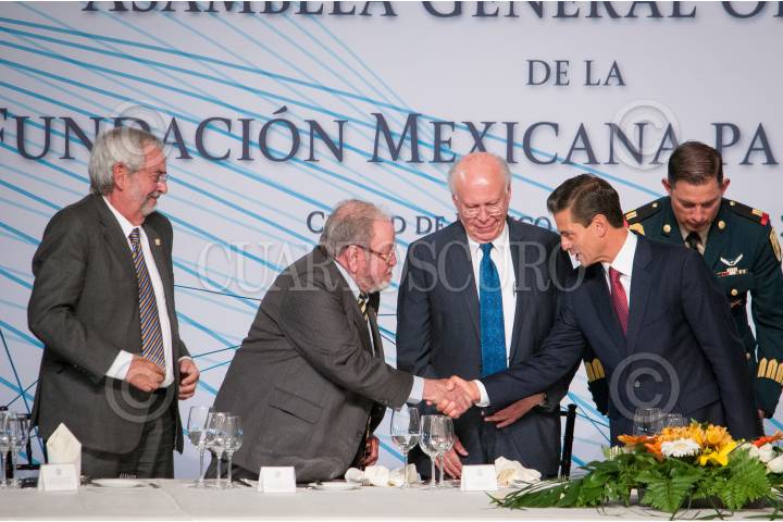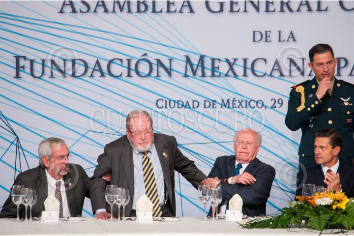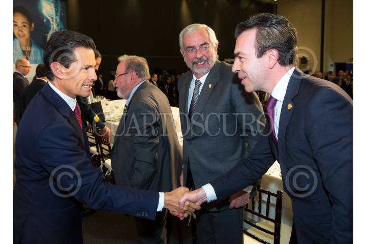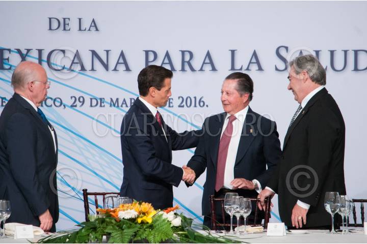 CIUDAD DE MÉXICO, 29MARZO2016.- Enrique Graue, rector de la Universidad Nacional Autónoma de México (UNAM); el doctor Guillermo Soberón Acevedo; José Narro Robles, secretario de salud y Enrique Peña Nieto, presidente de México, durante la XXXV Asamblea General Ordinaria de la Fundación Mexicana para la Salud en un hotel de Polanco. FOTO: DIEGO SIMÓN SÁNCHEZ /CUARTOSCURO.COM