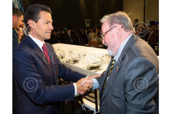 CIUDAD DE MÉXICO, 29MARZO2016.- El Presidente de la República, Enrique Peña Nieto, encabezó la 35ª Asamblea General Ordinaria de la Fundación Mexicana para la Salud, donde aseguró que la salud es una condición indispensable para el ejercicio de los demás derechos y libertades, y es el bien más preciado, la base del desarrollo individual, y lo que permite que mujeres y hombres puedan crecer, estudiar, trabajar, tener una vida plena y disfrutarla en compañía de sus seres queridos. En la imagen Enrique Peña Nieta saluda al ex rector de la UNAM Guillermo Soberón Acevedo. FOTO: PRESIDENCIA /CUARTOSCURO.COM