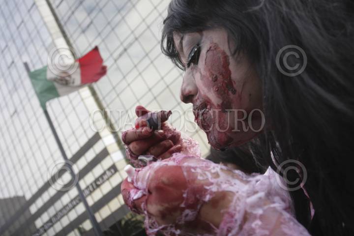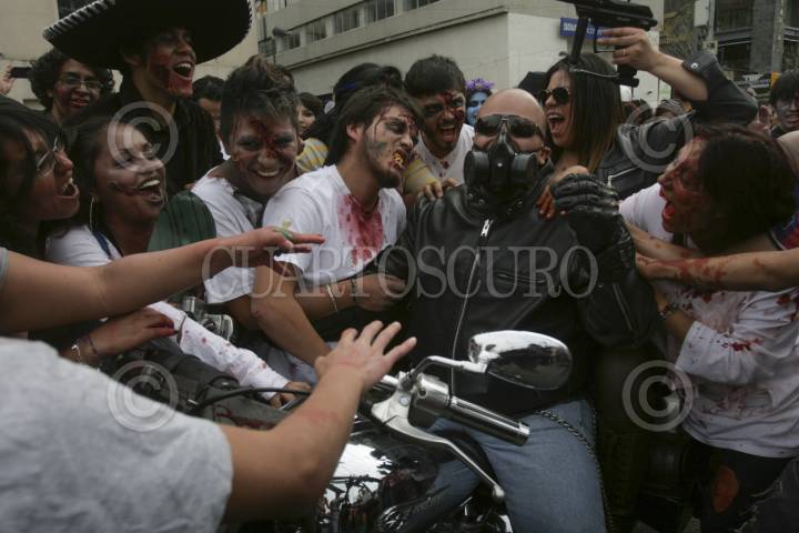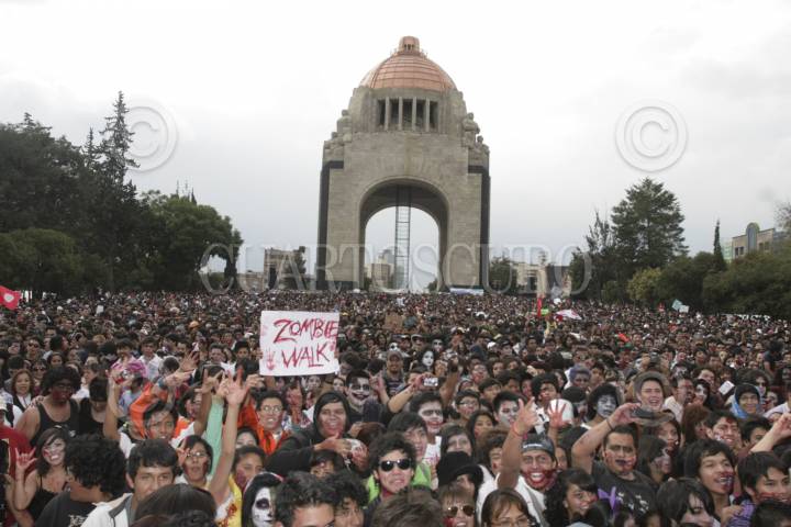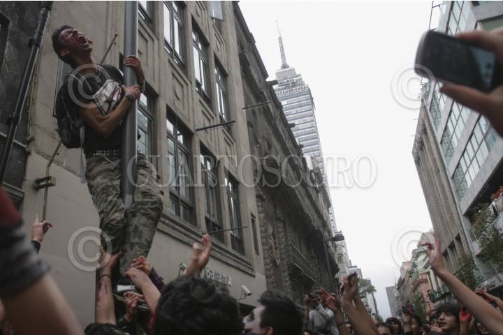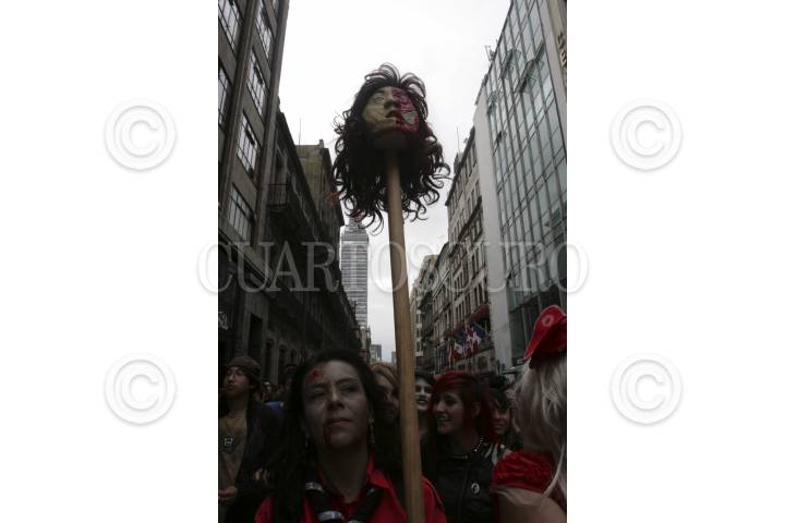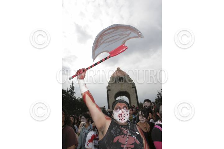 MÉXICO, D.F., 03NOVIEMBRE2012.-Personas disfrazadas participaron en el Zombie Walk Dead México, en el que se rompió el Record Guiness que reunió a nueve mil 806 personas caracterizada. Aunque en ocasiones los asistentes realizaron actos vandálicos golpeando cortinas de negocios y aventando latas y botellas de pet, la marcha llegó al Zócalo capitalino sin mayores incidentes. FOTO: JUAN PABLO ZAMORA /CUARTOSCURO.COM