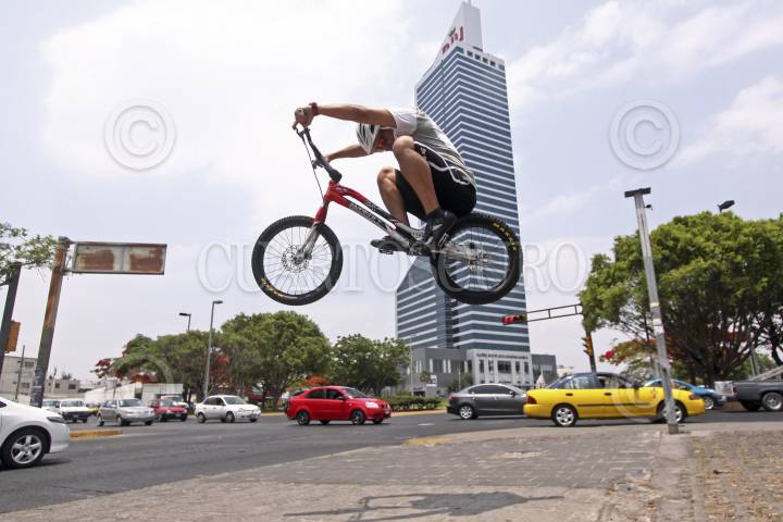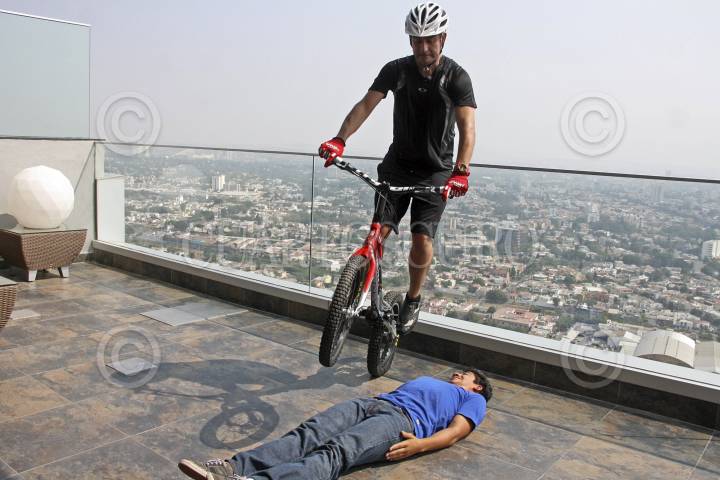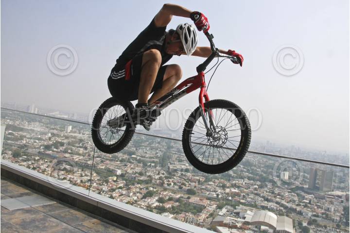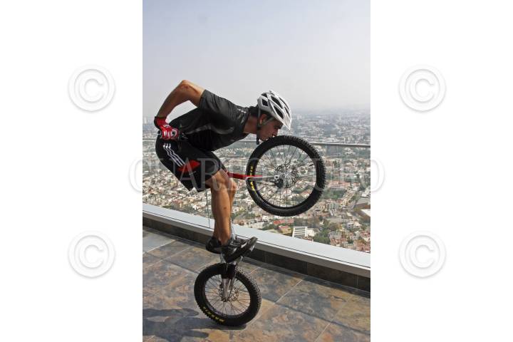 GUADALAJARA, JALISCO, 15MAYO2013.- El colombiano Javier Zapata, quien a impuesto seis veces Récord Guinness al subir a bordo de su bicicleta las edificaciones mas grandes de Latinoamérica, ascendió el Hotel RIU el mas alto en la ciudad y uno de los mas grandes de México porque consta de 41 pisos equivalentes aproximadamente a 1,066 escalones y en un tiempo de 33 minutos. FOTO: FERNANDO CARRANZA GARCÍA /CUARTOSCURO.COM