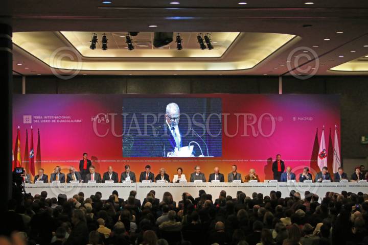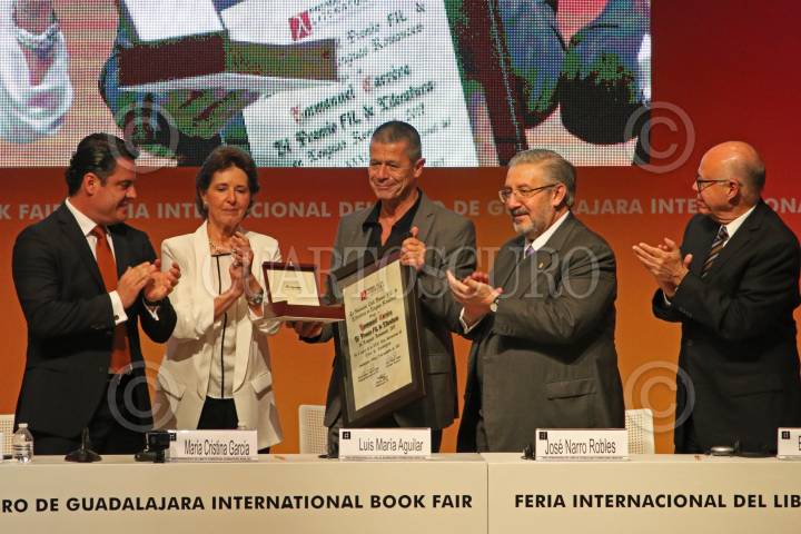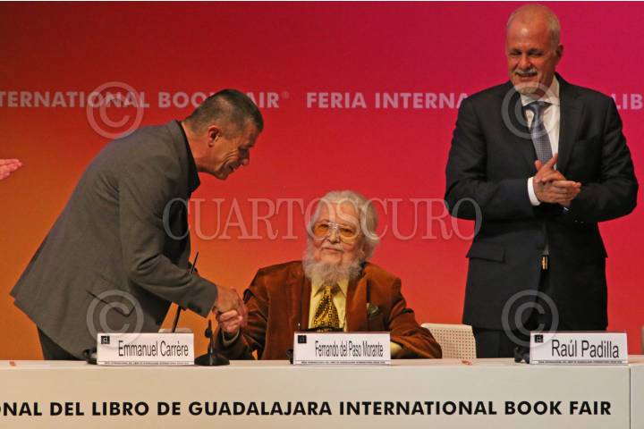 GUADALAJARA, JALISCO, 25NOVIEMBRE2017.- Emmanuel Carrère escritor y guionista Francés, recibió el Premio FIL en lenguas Romances durante la inauguración de la 31 edición de la Feria Internacional del Libro en Guadalajara (FIL), a la que asistieron José Narro Robles Secretario de Salud Federal, María Cristina García Secretaria de Cultura, Jorge Aristóteles Sandoval Díaz Gobernador del Estado, Enrique Alfaro Ramírez Presidente Municipal, Tonatiuh Bravo Padilla Rector de la Universidad de Guadalajara, Raúl Padilla López Presidente de la FIL, Marisol Schultz Directora General de la FIL, Fernando del Paso Escritor, entre otras personalidades. También se llevo a cabo la inauguración del Pabellón del País Invitado de Honor Madrid, todo esto en la feria antes mencionada que se lleva a cabo en Expo Guadalajara. FOTO: FERNANDO CARRANZA GARCIA / CUARTOSCURO.COM